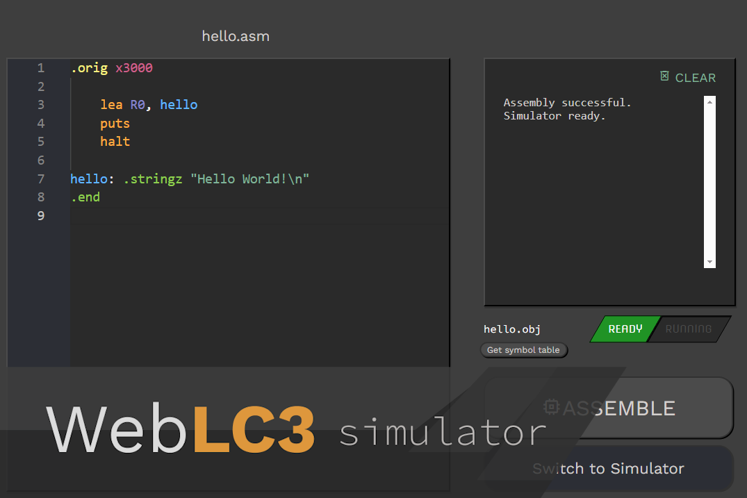 WebLC3 is an open source, web-based code editor, assembler and simulator/debugger for the LC-3 assembly language, which I developed with Andrea Abellera in 2022 for the University of Manitoba. Another colleague of mine, Zoey Kitt, added support for a subset of the ARM Thumb instruction set the following year. Since its creation, it's been used to teach low-level computing to hundreds of computer science students.